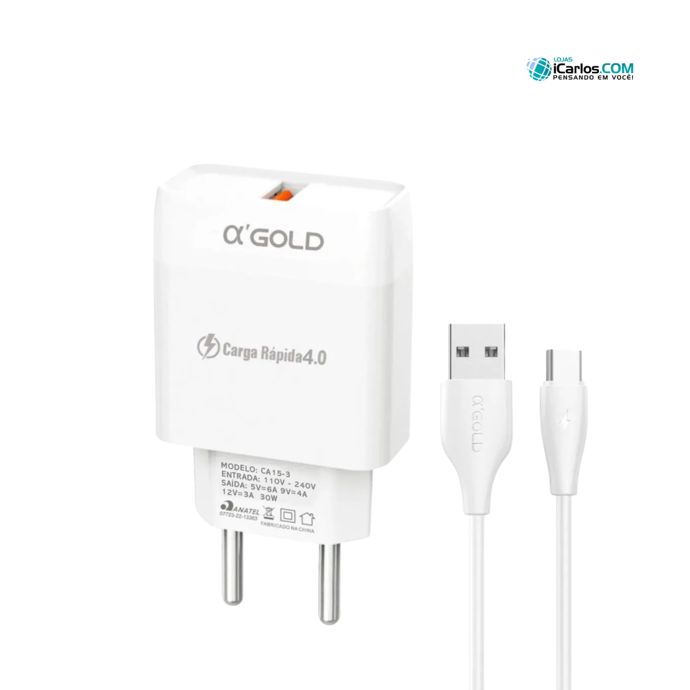 O Kit Carregador Turbo Tipo-C 30W 6.0A A'GOLD CA15-3 garante carregamento rápido e eficiente, proporcionando até 30W de potência. Com um cabo USB de 1 metro, design resistente e compacto, é perfeito para quem busca praticidade e durabilidade no dia a dia, mantendo seus dispositivos sempre prontos para uso com segurança e alta performance.