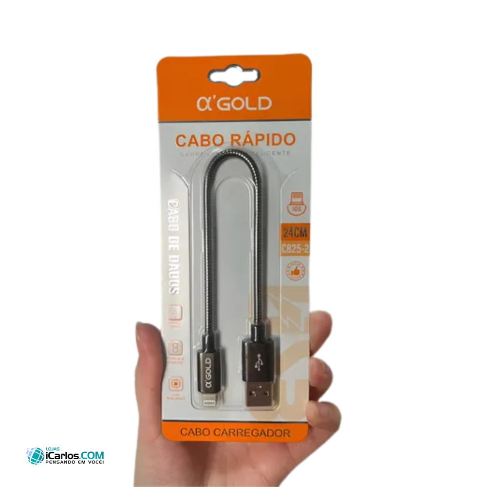 o cabo garante praticidade e liberdade de movimentos. A corrente de 2.1A permite um carregamento rápido e seguro para seus dispositivos Apple, enquanto o design metalizado dourado traz um toque de elegância e exclusividade.